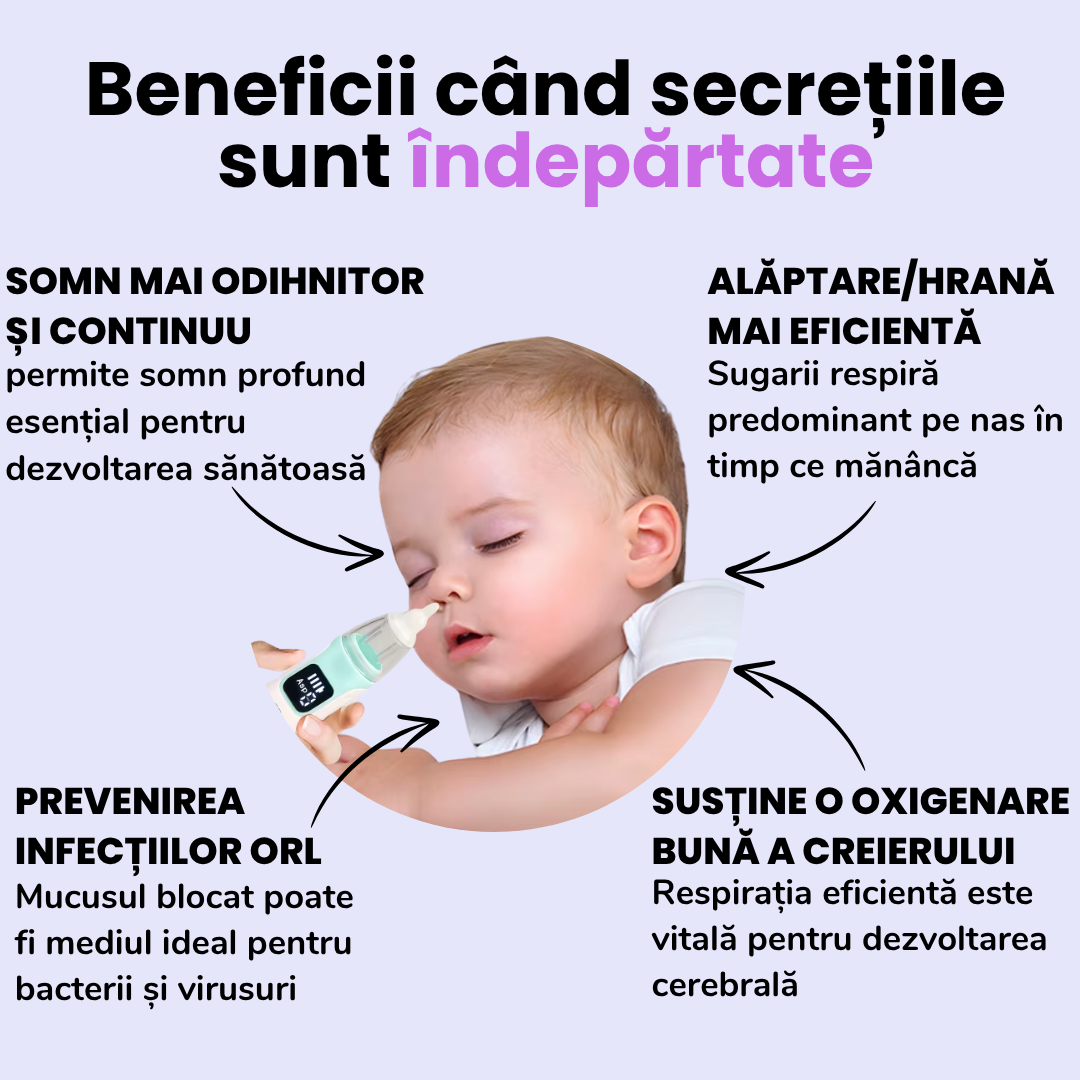 Mucusul acumulat poate duce la infecții, otite și bronșite. Aspiratorul ajută la prevenirea acestor probleme.