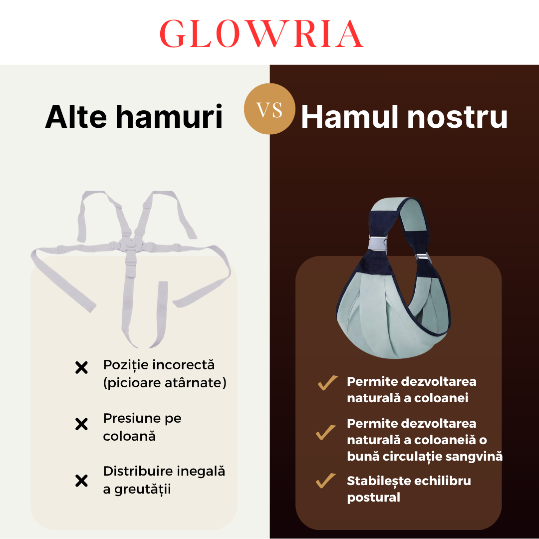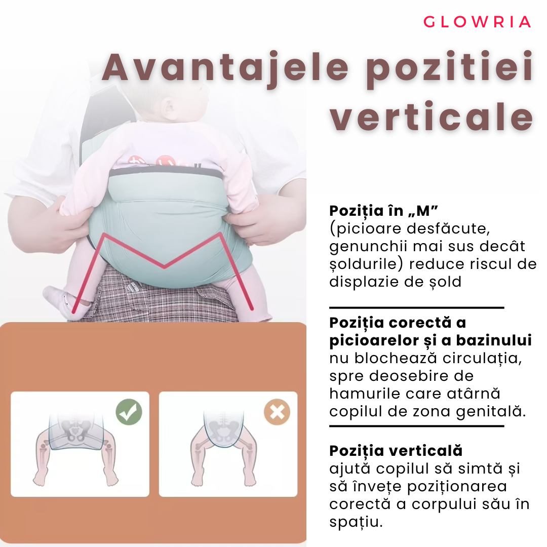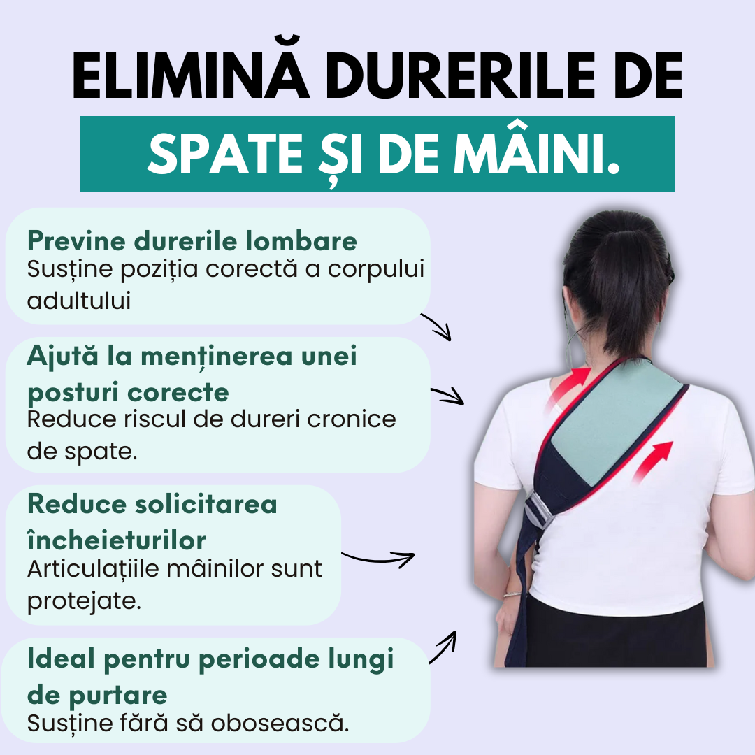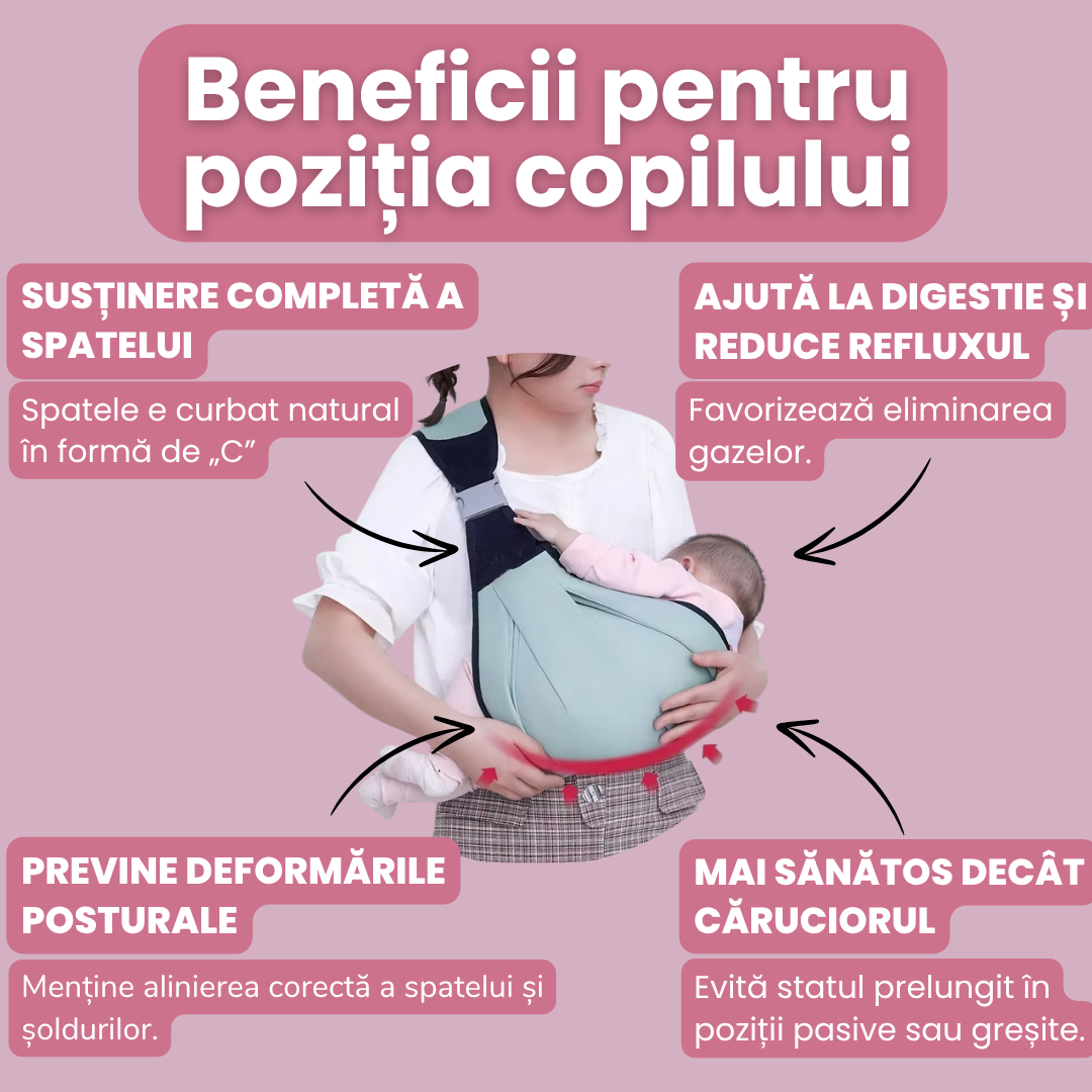 Designul său unic distribuie greutatea echilibrat, protejând spatele și umerii părinților, iar materialul delicat îl face perfect pentru pielea sensibilă a bebelușului