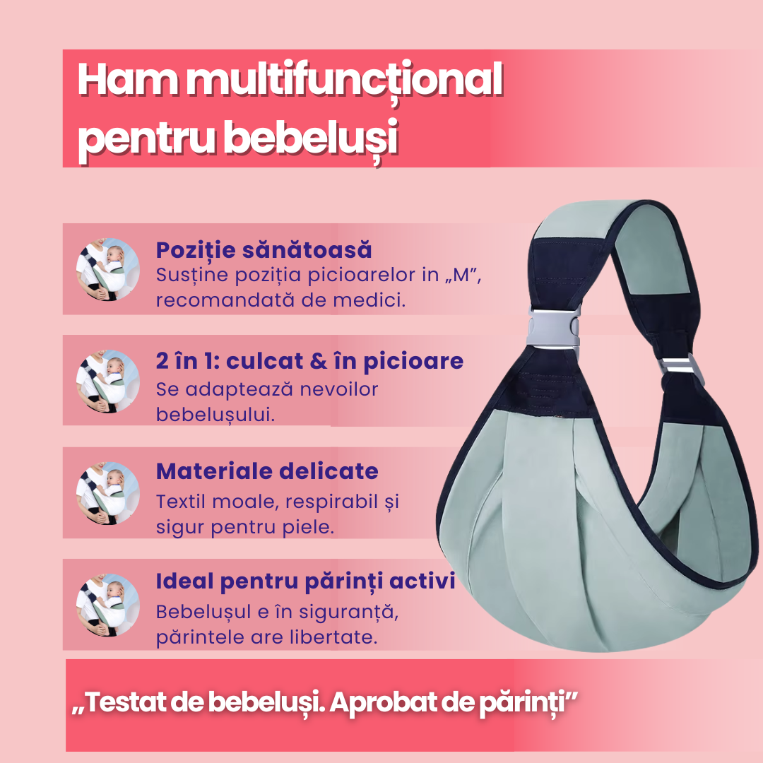 Un ham tip hamac, ergonomic, 2 în 1, gândit pentru a susține poziția corectă a copilului în timp ce îl porți în brațe.